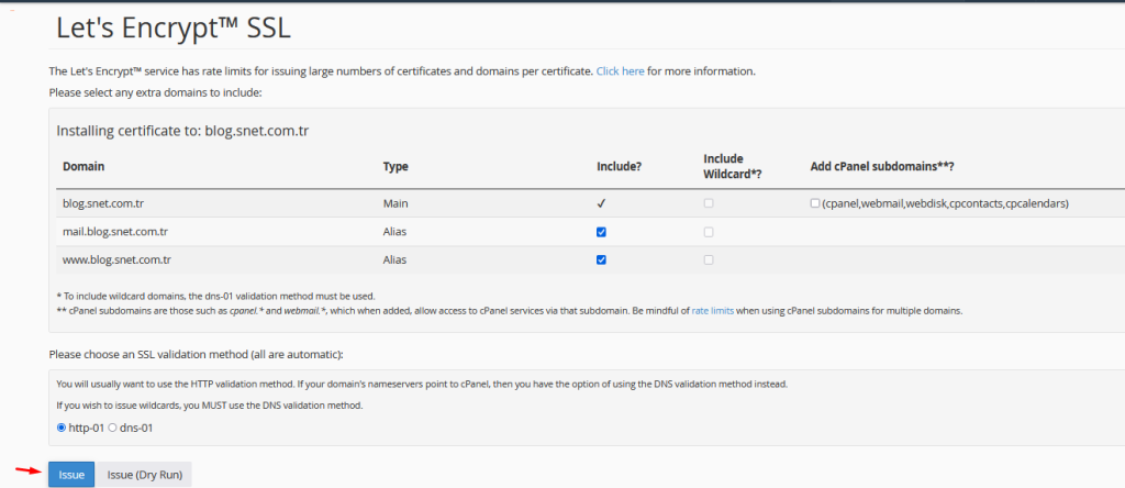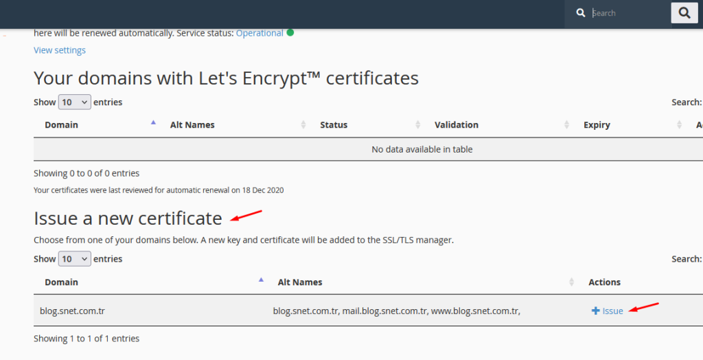 Bu ekran üzerinde SSL kurulumu yapmak için Issue a new certificate başlığında yer alan İssue butonuna basıyoruz.
